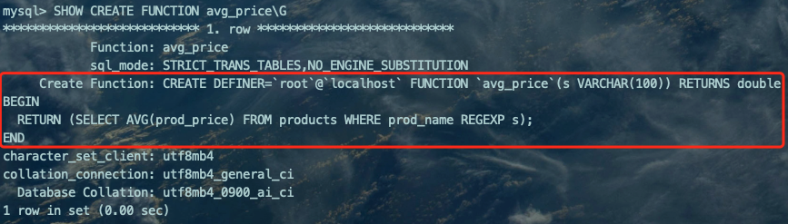 我们定义了一个名叫avg_price的函数,它接收一个VARCHAR(100)类型的参数,声明的返回值类型是DOUBLE,需要注意的是,我们在RETURN语句后边写了一个SELECT语句,表明这个函数的返回结果就是根据这个查询语句产生的,也就是返回了某类商品的平均价格。