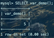 我们定义了一个名叫var_demo而且不需要参数的函数,然后在函数体中声明了一个名称为c的INT类型的局部变量,之后我们调用SET语句为这个局部变量赋值了整数5,并且把局部变量c当作函数结果返回。我们调用一下这个函数: