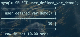 DELIMITER $$CREATE FUNCTION user_defined_var_demo()RETURNS INTBEGIN SET @abc = 10; RETURN @abc;END $$DELIMITER ;