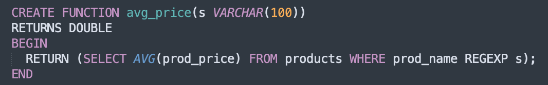 DELIMITER $CREATE FUNCTION avg_price(s VARCHAR(100))RETURNS DOUBLEBEGIN DECLARE a DOUBLE; SET a = (SELECT AVG(prod_price) FROM products WHERE prod_name REGEXP s); RETURN a;END $DELIMITER ;