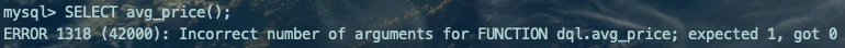 另外,函数参数不可以指定默认值,我们在调用函数的时候,必须显式的指定所有的参数,并且参数类型也一定要匹配,比方说我们在调用函数avg_price时,必须指定我们要查询的商品名,不然会报错的: