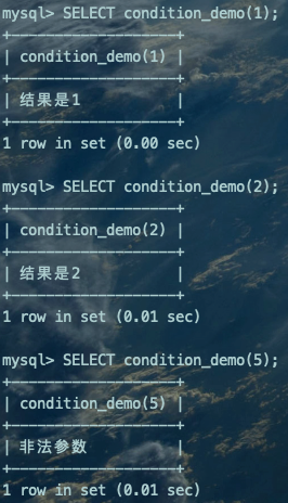 DELIMITER $$CREATE FUNCTION condition_demo(i INT)RETURNS VARCHAR(10)BEGIN DECLARE result VARCHAR(10); IF i = 1 THEN SET result = '结果是1'; ELSEIF i = 2 THEN SET result = '结果是2'; ELSEIF i = 3 THEN SET result = '结果是3'; ELSE SET result = '非法参数'; END IF; RETURN result;END $$DELIMITER ;