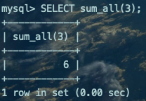 在函数sum_all中,我们接收一个INT UNSIGNED类型的参数,声明了两个INT类型的变量i和result。我们先测试一下这个函数: