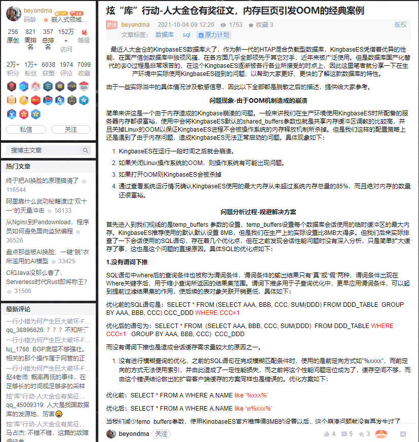 本篇分享内容来自一位码龄14年的专家级博主,其结合KingbaseES介绍内存巨页引发OOM的经典案例深受好评。