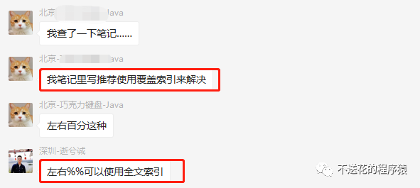 全文索引这个不用说,那是能让全模糊查询走索引的。但是索引覆盖这个方案,我觉得才是符合背景的: