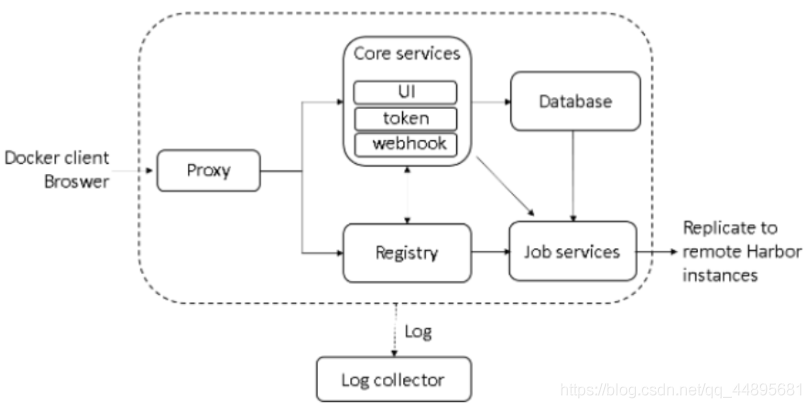 Proxy:Harbor的registry, UI, token等服务,通过一个前置的反向代理统一接收浏览器、Docker客户端的请求,并将请求转发给后端不同的服务。