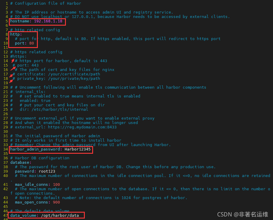 [root@k8s-master ~]# wget https://github.com/goharbor/harbor/releases/download/v2.3.2/harbor-offline-installer-v2.3.2.tgz[root@k8s-master ~]# ll harbor-offline-installer-v2.3.2.tgz-rw-r--r-- 1 root root 605477475 9月 15 11:12 harbor-offline-installer-v2.3.2.tgz[root@k8s-master ~]# tar -xvf harbor-offline-installer-v2.3.2.tgzharbor/harbor.v2.3.2.tar.gzharbor/prepareharbor/LICENSEharbor/install.shharbor/common.shharbor/harbor.yml.tmpl[root@k8s-master ~]# cd harbor/[root@k8s-master harbor]# lscommon.sh harbor.v2.3.2.tar.gz harbor.yml.tmpl install.sh LICENSE prepare
