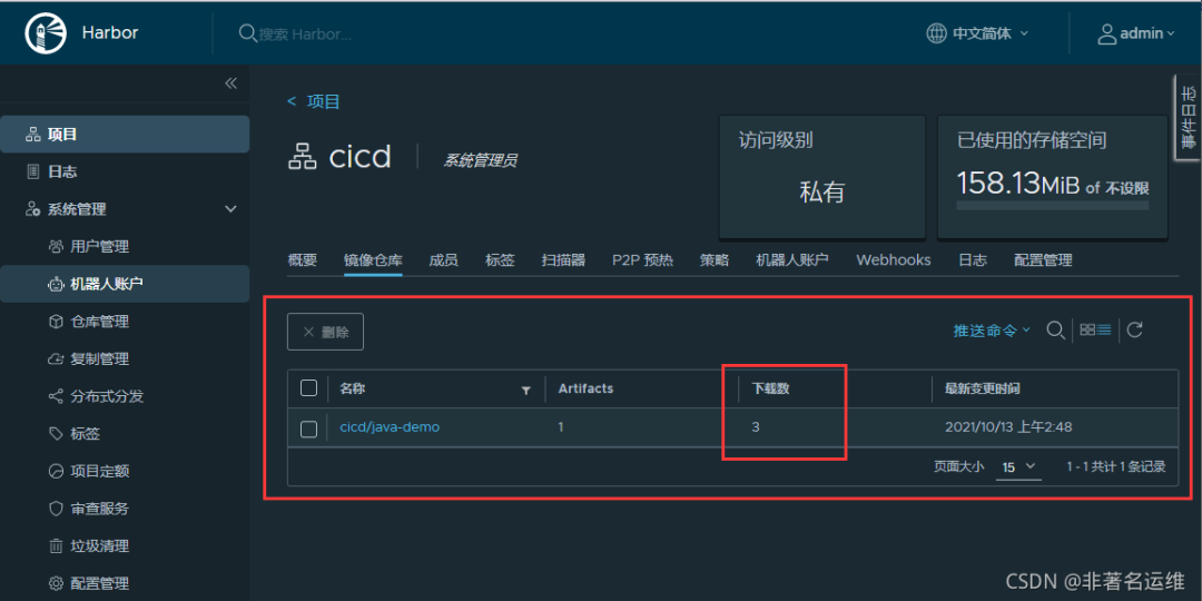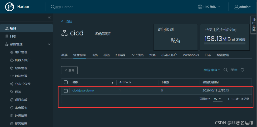 [root@k8s-master harbor]# docker tag java-demo:v1.0 192.168.1.18/cicd/java-demo:v1.0 //根据每次上传的镜像版本打相应的标签,做好标识[root@k8s-master harbor]# docker images | grep javajava-demo v1.0 96dbaacabd81 22 months ago 406MB192.168.1.18/cicd/java-demo v1.0 96dbaacabd81 22 months ago 406MB[root@k8s-master harbor]# docker push 192.168.1.18/cicd/java-demo:v1.0The push refers to repository [192.168.1.18/cicd/java-demo]85d053b8761f: Pushedc7cfd67e17c7: Pushedceead5ca823f: Pushed2353c173a26a: Pushed071d8bd76517: Pushedv1.0: digest: sha256:4e43b2bcd81adf6d00b46a5c7efd384fc9f5b059c75255c8c89404ed4818bae3 size: 1371