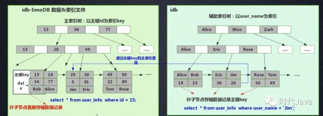 InnoDB 是聚集索引方式,因此数据和索引都存储在同一个文件里。首先 InnoDB 会根据主键 ID 作为 KEY 建立索引 B+树,如左下图所示,而 B+树的叶子节点存储的是主键 ID 对应的数据,比如在执行 select * from user_info where id=15 这个语句时,InnoDB 就会查询这颗主键 ID 索引 B+树,找到对应的 user_name='Bob'。