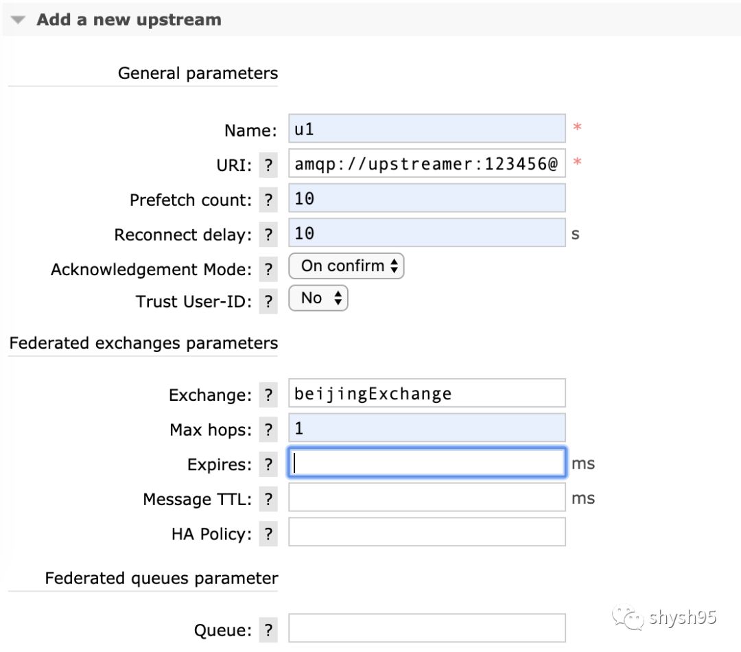 uri:定义upstream的AMQP连接,我们这里设置的是amqp://upstreamer:123456@rabbit111:5672(这里是一个北京集群一个节点地址),格式amqp://username:password@host:port