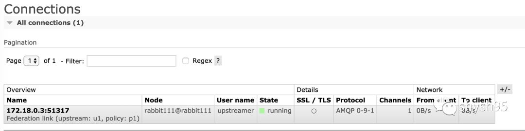 Federation插件会在队列federation:exchangeA->Broker B与BrokerA中的交换器exchangeA之间建立一条AMQP连接来实时地消费队列federation:exchangeA->Broker B中的数据。这些操作都是内部的,对外部业务客户端来说这条Federation link建立在BrokerA的exchangeA和BrokerB的exchangeA之间。