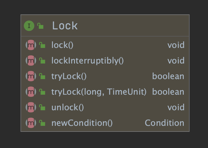 Lock 是一个顶级接口,它的所有方法如下图所示: