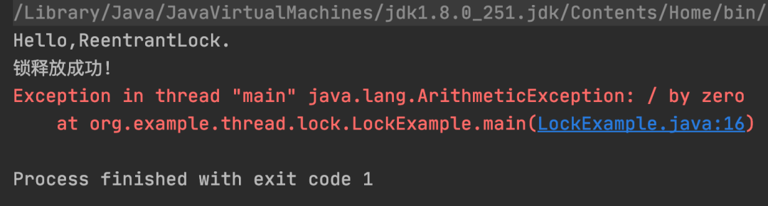 从上述结果可以看出,虽然方法中出现了异常情况,但并不影响 ReentrantLock 锁的释放操作,这样其他使用此锁的线程就可以正常获取并运行了。