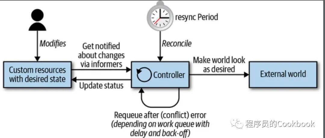1. 读取资源的状态(更可取的方式是通过事件驱动的方式来读取)2. 改变集群中对象的状态,比如启动一个POD、创建一个网络端点、查询一个cloud API等3. 通过API server来更新Setp1中的资源状态(Optimistic Concurrency)mak4. 循环重复,返回到Setp1