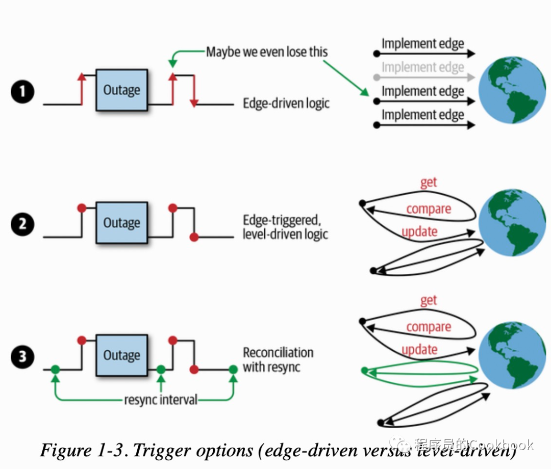 1.Edge driven trigger 没有处理事件丢失的问题2.Edge driven trigger + Level-driven triggers,总是去获取最新的状态(当有事件来的时候),因此即使丢失一个事件,仍然可以通过获取最新的状态来进行业务逻辑3.Edge driven trigger + Level-driven triggers + resync 如果最后一个事件丢失了,后面没有事件来了,所以也不会去触发(Level-driven triggers),这个时候需要借助resync来得到最新的状态。