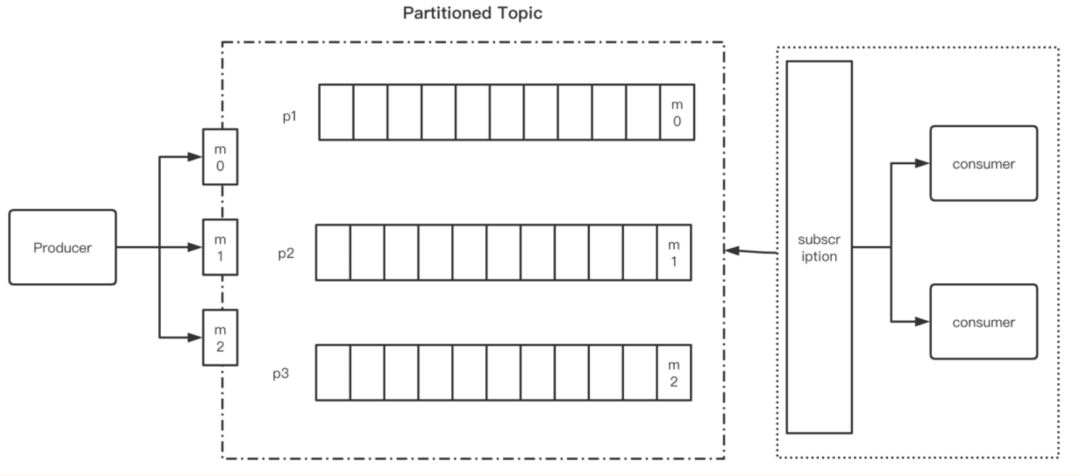 如上图所示,Pulsar 提供了最基本的 pub-sub 的处理模型。