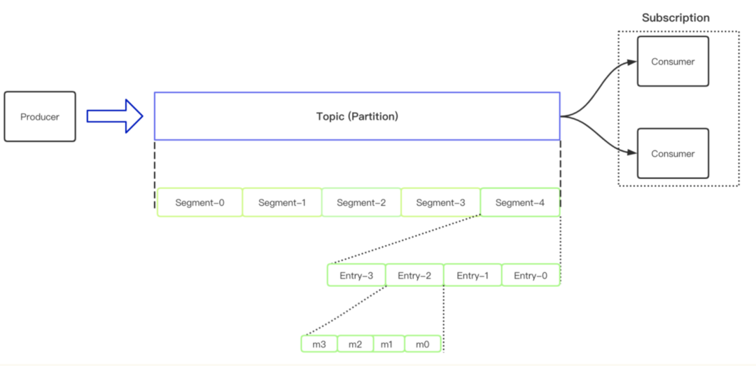 首先第一层抽象是 Topic(Partition),用来存储 Producer 追加的 messages 信息,Topic 之下对应的是一个个的 ledger,ledger 里面又划分为一个个的分片,在一个个的分片中存储了更小粒度的 ertries,entries 中存储的是 【一条】或者 【一个 batch】 的消息。