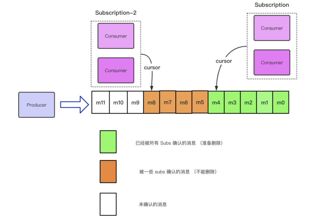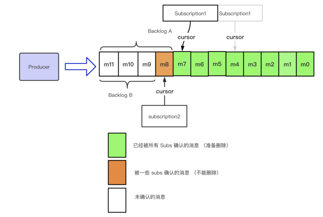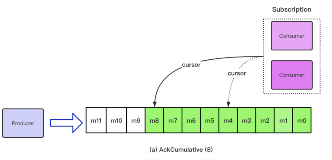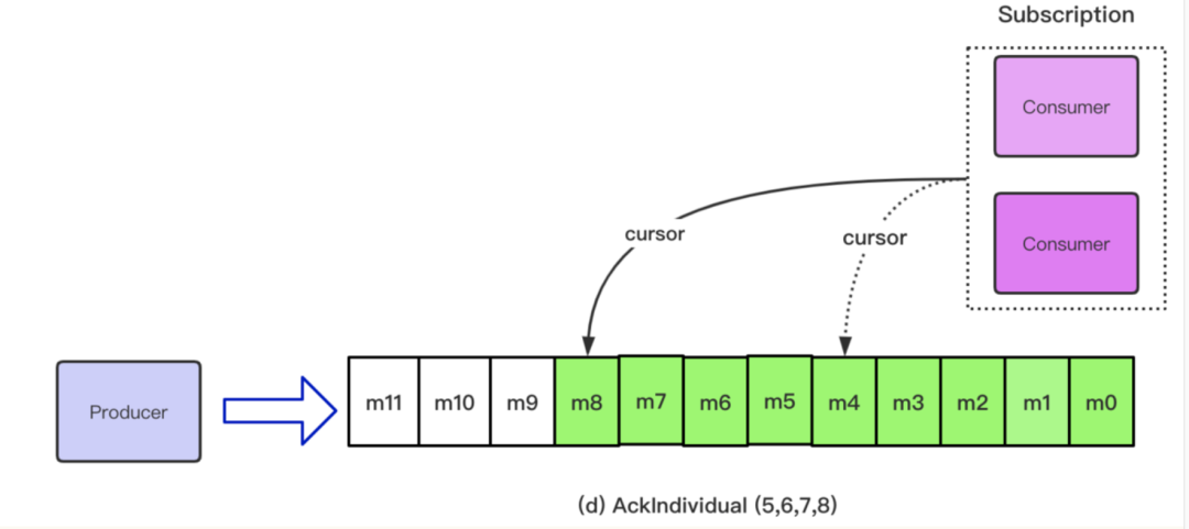 随着时间的推移,假设在 AckCumulative 的场景下,上述订阅中的 Consumer 又消费了一些消息,目前 Cursor 的位置移动到了 m8 的位置,意味着 m8 之前的消息都可以进入删除状态。