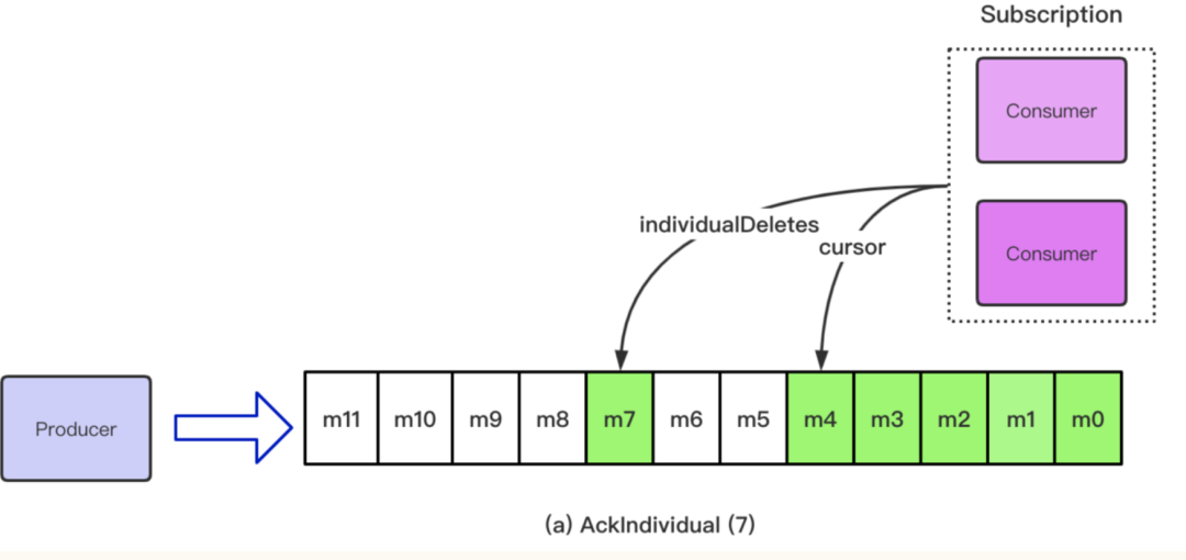假设是在 AckIndividual 的场景下,上述订阅中的 Consumer 只消费了 m7 这条消息并且发送了 Ack 请求,m5, m6 这两条消息仍然没有被成功消费,那么目前处于可删除状态的消息是 m4 之前的消息和 m7 这条消息。也就是说,在这种场景下,由于使用单条 Ack 导致 Topic 中间出现了 Ack 的空洞。