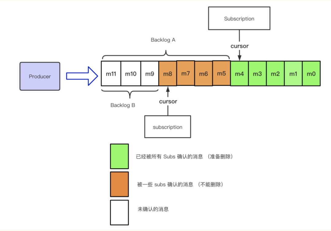 所有没有被确认的消息会一直保存在 Subscription backlog 中