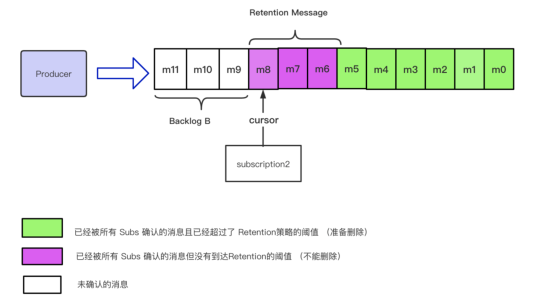 在上图中,针对该 Topic,有两个订阅:Subscription-1 和 Subscription-2。Subscription-1中的 Consumer 消费掉了 m4 之前的消息,Subscription-2 中的 Consumer 消费掉了 m8 之前的消息。而 m4-m8 之间的这四条消息,虽然被 Subscription-2 消费完成,但是 Subscription-1 还没有消费完成这部分数据,所以这部分消息还不可以被删除。目前处于可删除状态的消息是 m4 之前的消息,即这个 Topic 中消费进度最慢的那个 Subscription 所消费完成的消息。那么这就会有一个问题,假设我目前 Subscription-1 掉线了,它的 Cursor 的位置一直没有变化,这就会导致这个 Topic 中的数据一直处于不可删除的状态。