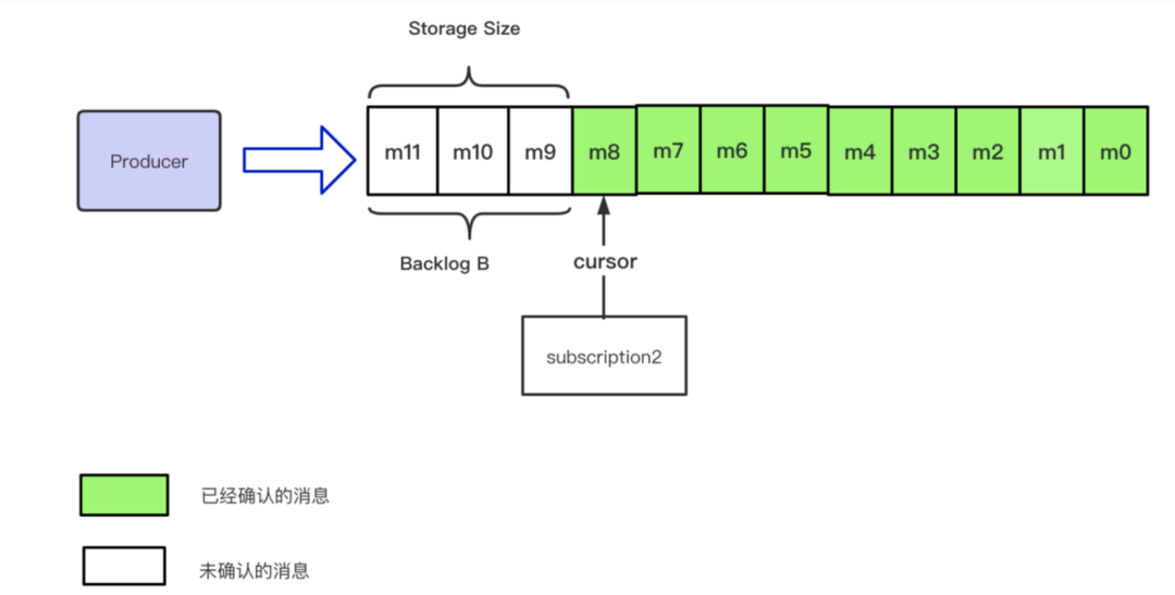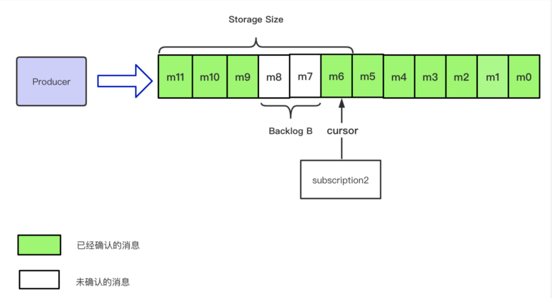 为了更好的理解 Strorage Size 以及 Backlog, 我们首先需要去了解 Pulsar 中的订阅机制,如下图所示: