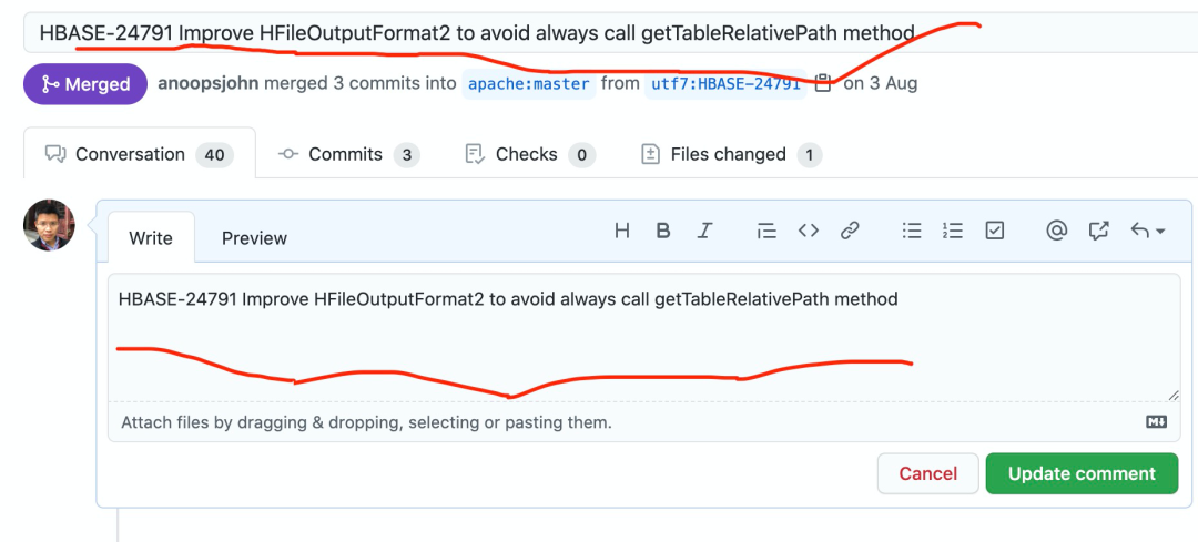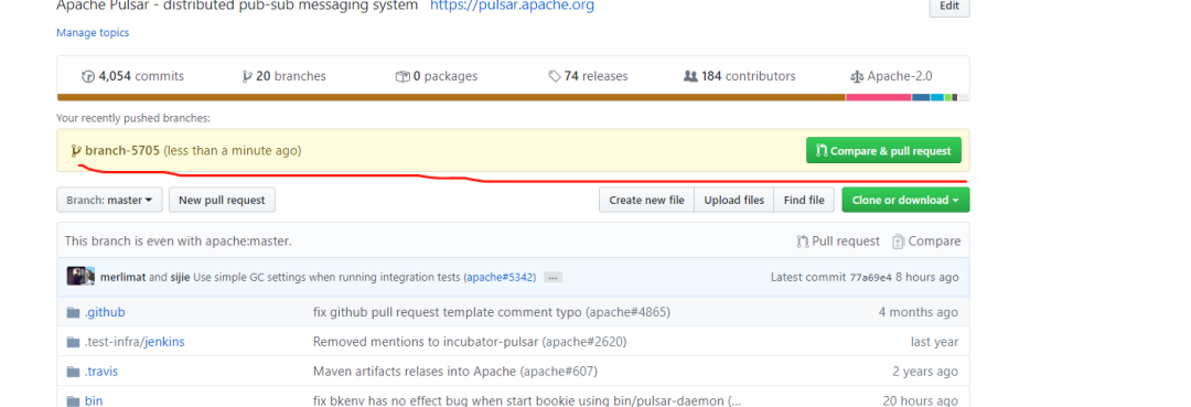然后去github 看,会触发一个让你创建一个pull/merge之类的(我合理截图的是之前提交给pulsar的,hbase 也是一样的)