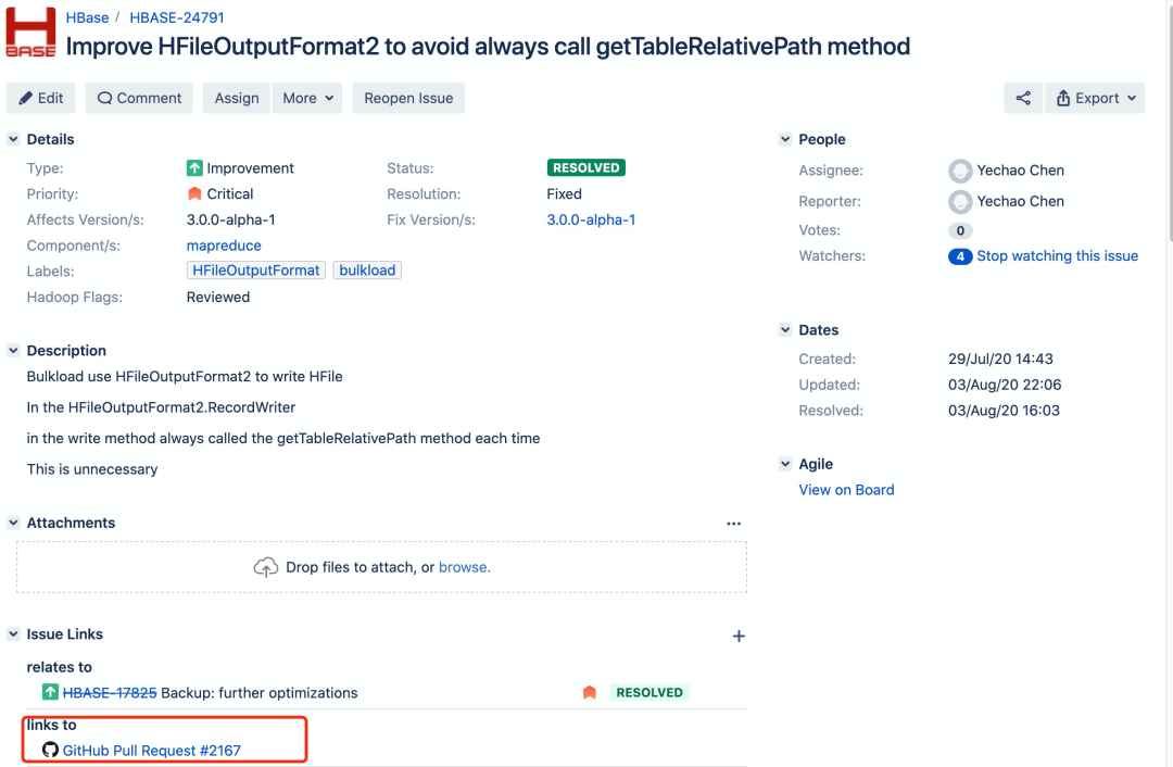 然后过一会去HBase jira 空间会看到自动链接一个pull request