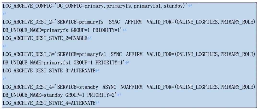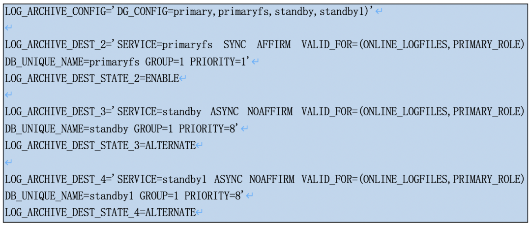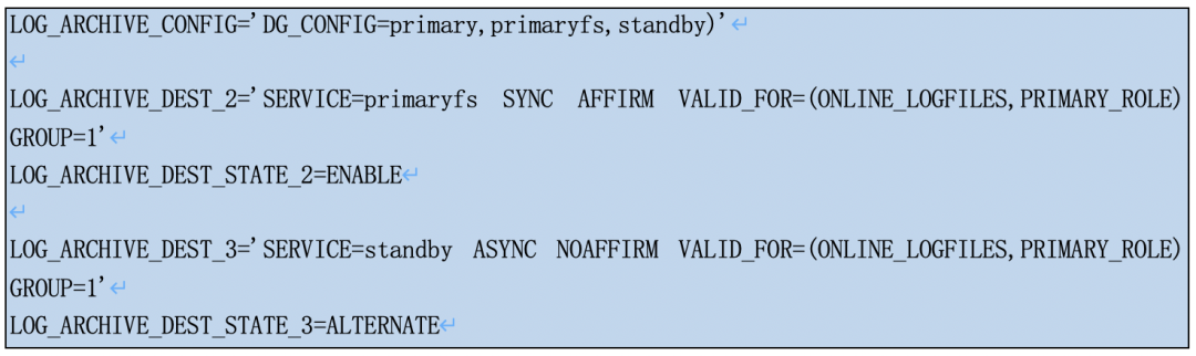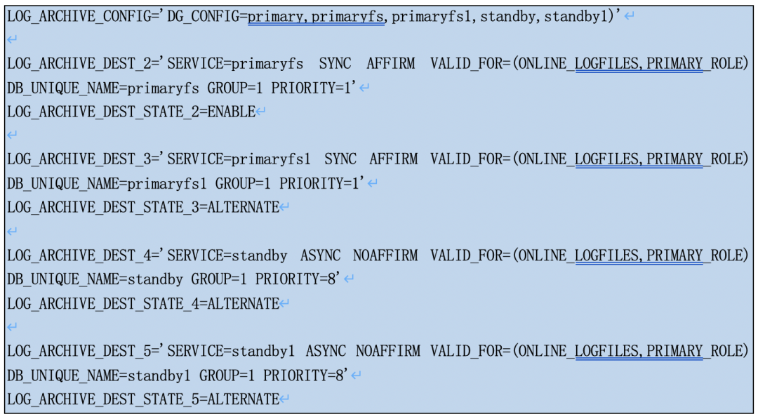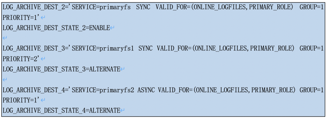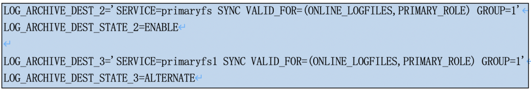 如下例子中,LOG_ARCHIVE_DEST_2和LOG_ARCHIVE_DEST_3组成一个group.当LOG_ARCHIVE_DEST_2失效时候,系统会自动切换到LOG_ARCHIVE_DEST_3进行日志远程归档,ALTERNATE即为备用的意思。
