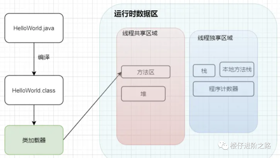Java文件经过编译后变成 .class 字节码文件 字节码文件通过类加载器被搬运到 JVM 虚拟机中 虚拟机主要的5大块:方法区,堆都为线程共享区域,有线程安全问题,栈和本地方法栈和计数器都是独享区域,不存在线程安全问题,而 JVM 的调优主要就是围绕堆,栈两大块进行。