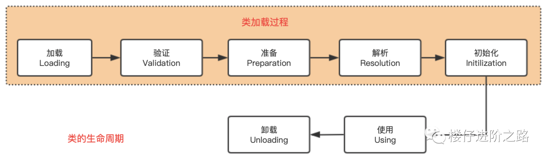 类加载的过程包括了加载、验证、准备、解析、初始化五个阶段。在这五个阶段中,加载、验证、准备和初始化这四个阶段发生的顺序是确定的,而解析阶段则不一定,它在某些情况下可以在初始化阶段之后开始,这是为了支持Java语言的运行时绑定(也成为动态绑定或晚期绑定)。另外注意这里的几个阶段是按顺序开始,而不是按顺序进行或完成,因为这些阶段通常都是互相交叉地混合进行的,通常在一个阶段执行的过程中调用或激活另一个阶段。