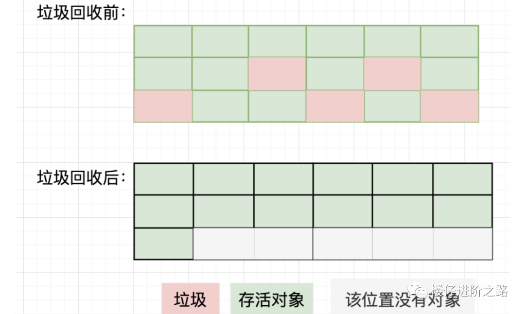 标记--整理算法算是一种折中的垃圾收集算法,在对象标记的过程,和前面两个执行的是一样步骤。但是,进行标记之后,存活的对象会移动到堆的一端,然后直接清理存活对象以外的区域就可以了。这样,既避免了内存碎片,也不存在堆空间浪费的说法了。但是,每次进行垃圾回收的时候,都要暂停所有的用户线程,特别是对老年代的对象回收,则需要更长的回收时间,这对用户体验是非常不好的。