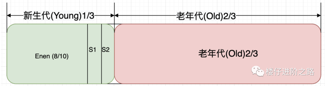 Java堆区可以划分为新生代和老年代,新生代又可以进一步划分为Eden区、Survivor 1区、Survivor 2区。具体比例参数的话,可以看一下这张图。