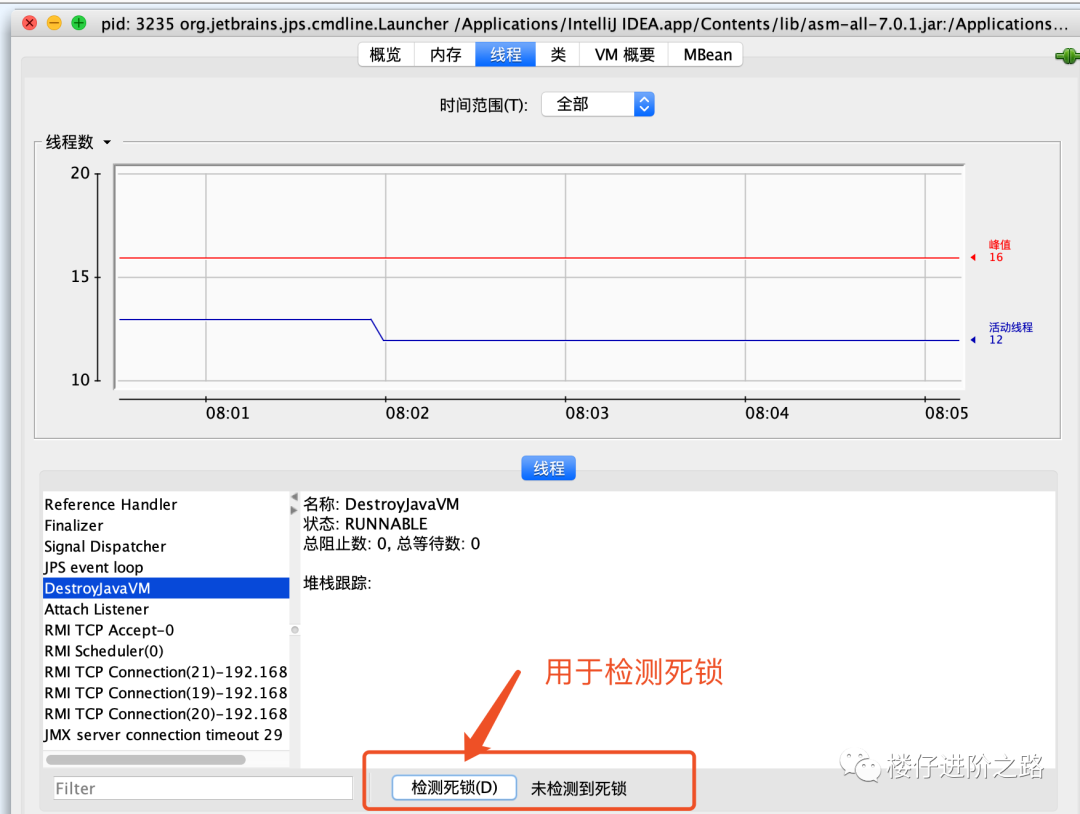线程:相当于可视化的jstack命令,同时也可以点击“检测死锁”来检查线程之间是否有死锁的情况。