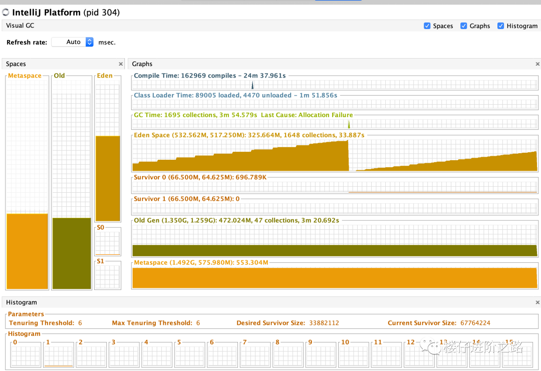 Visual GC 是常常使用的一个功能,需要通过插件按照,可以明显的看到年轻代、老年代的内存变化,以及gc频率、gc的时间等,感觉这个插件很酷!