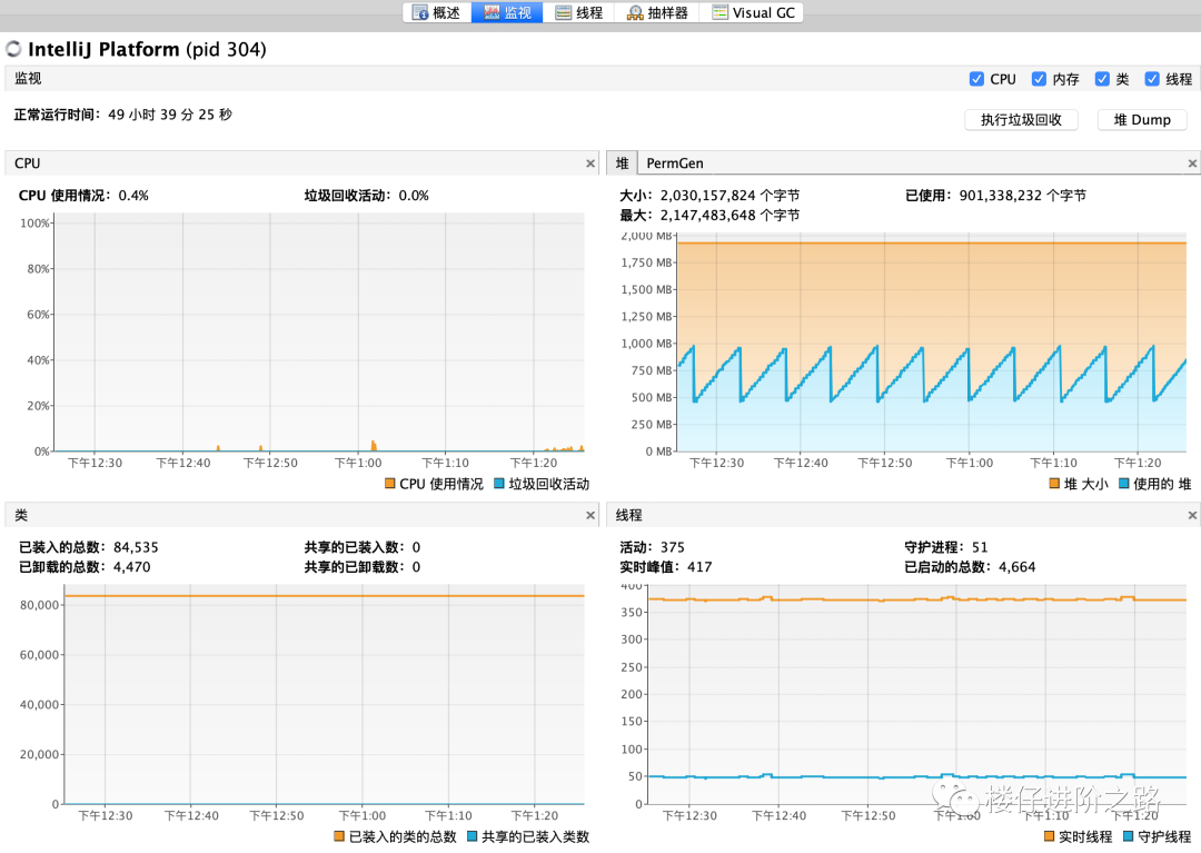 概览:包括堆内存使用情况、线程、类、CPU使用情况四项信息的曲线图。