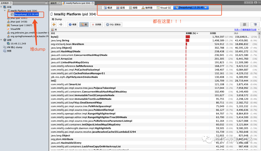 3、VisualVM 对 堆dump文件进行分析,通过VisualVM查看到占用内存最大的对象是String对象,本来想跟踪着String对象找到其引用的地方,但dump文件太大,跟踪进去的时候总是卡死,而String对象占用比较多也比较正常,最开始也没有认定就是这里的问题,于是就从线程信息里面找突破点。