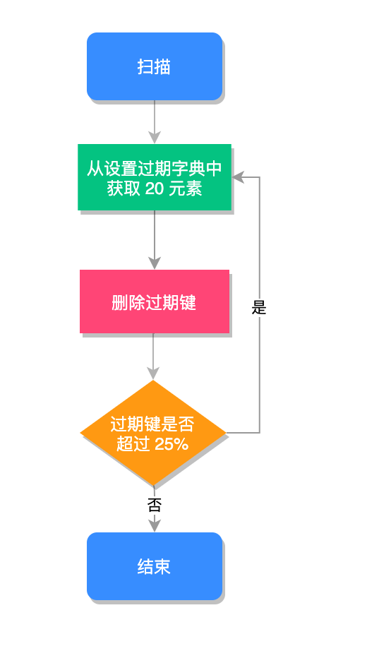 ,Redis 会随机抽取 20 个值,删除这 20 个键中过期的键,如果过期 key 的比例超过 25% ,重复执行此流程,如下图所示: