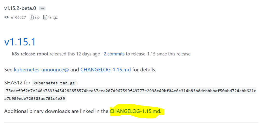 从官网https://github.com/kubernetes/kubernetes/releases 找到对应的版本号,单击changelog,找到已经编译好的二进制文件的下载页面;如下图所示: