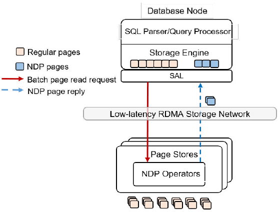 在传统数据库中,SQL执行引擎从存储中获取数据,并执行包括投影、谓词计算和聚合在内的步骤。对于经常涉及大型表扫描的分析查询,SQL执行引擎必须从存储中读取大量数据页。当存储节点与计算分离,通过网络通讯时,大表扫描会转化为增加的网络流量。一个典型的例子是对一个非常大的表进行计数查询,查询对象表的所有页面必须从页面存储池(Page stores)发送到要计数的数据库节点,之后,数据库节点将丢弃这些页面中的大部分,因为缓冲区池不能装载这么多数据页,这是对网络带宽资源的浪费。华为云创新的NDP(Near Data Processing,近数据处理,简称NDP)方案解决了这一问题。