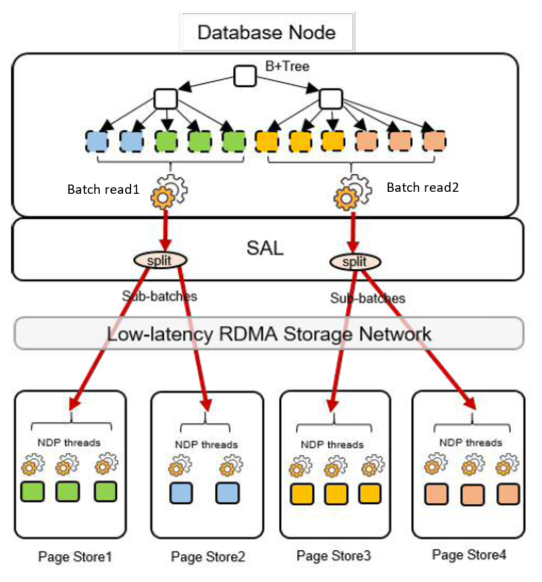 下图阐述了批处理读取的工作原理。数据库节点发送批量请求,SAL(存储抽象层)标识页面所在的页面存储,并将批处理读取拆分为多个子读取:每个页面存储一个子读取。然后,子读取将并行发送到页面存储。使用这种方法,可以同时使用多个页面存储来服务NDP请求。