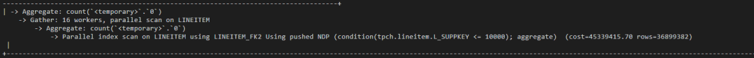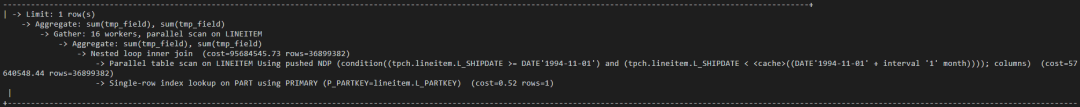 您可以使用“explain”查询以了解是否为查询启用了NDP。例如,以下是树格式的TPC-H查询14的解释输出。为LINEITEM表扫描启用了NDP,投影和谓词计算都会推送到数据页面存储区。此外,还为LINEITEM表扫描启用了PQ。