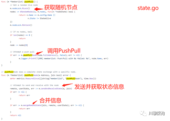 push/pull协程周期性的从已知的alive的集群节点中选1个节点进行push/pull交换信息。交换的信息包含2种