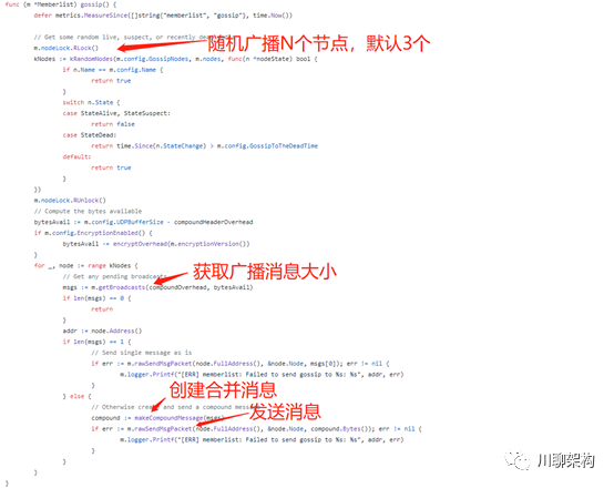 Gossip协程通过udp协议向K个节点发送消息,节点从广播队列里面获取消息,广播队列里的消息发送失败超过一定次数后,消息就会被丢弃。