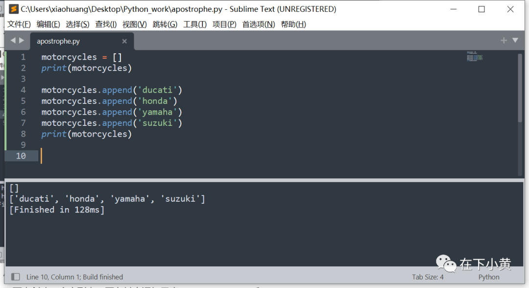 方法append()将元素'ducati'添加到列表末尾,而不影响列表中的其他所有元素: