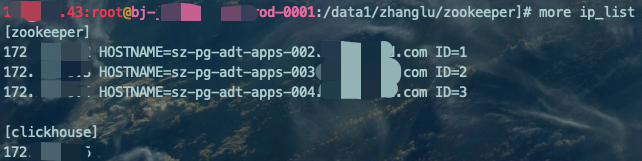 mkdir zookeepercd zookeepervim ip_list[zookeeper]172.xx.xx.x HOSTNAME=sz-pg-adt-apps-002.xxxxxx.com ID=1172.xx.xx.x HOSTNAME=sz-pg-adt-apps-003.xxxxxx.com ID=2172.xx.xx.x HOSTNAME=sz-pg-adt-apps-004.xxxxxx.com ID=3[clickhouse]172.xx.xx.x