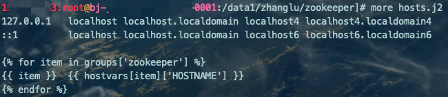 vim hosts.j2127.0.0.1 localhost localhost.localdomain localhost4 localhost4.localdomain4::1 localhost localhost.localdomain localhost6 localhost6.localdomain6{% for item in groups['zookeeper'] %}{{ item }} {{ hostvars[item]['HOSTNAME'] }}{% endfor %}