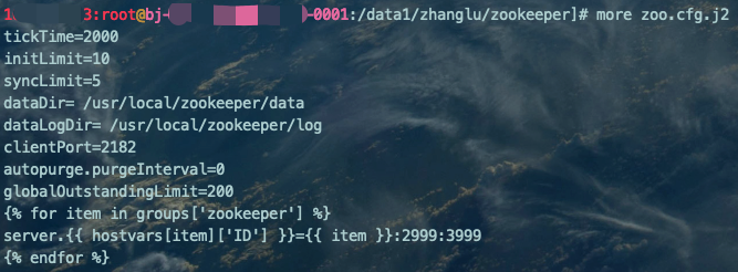 vim zoo.cfg.j2tickTime=2000initLimit=10syncLimit=5dataDir= /usr/local/zookeeper/datadataLogDir= /usr/local/zookeeper/logclientPort=2182autopurge.purgeInterval=0globalOutstandingLimit=200{% for item in groups['zookeeper'] %}server.{{ hostvars[item]['ID'] }}={{ item }}:2999:3999{% endfor %}