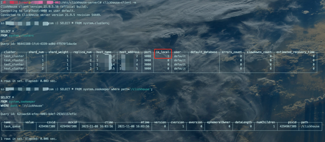 # 登录SQL对话框clickhouse-client -m# 查看当前集群状态SELECT * FROM system.clusters;# 查看ZK信息SELECT * FROM system.zookeeper where path='/clickhouse';