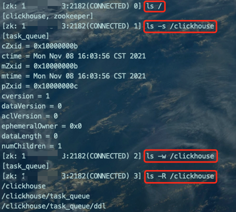 zkCli.sh -server 172.xx.xx.x:2182ls /ls -s /clickhousels -w /clickhousels -R /clickhouse